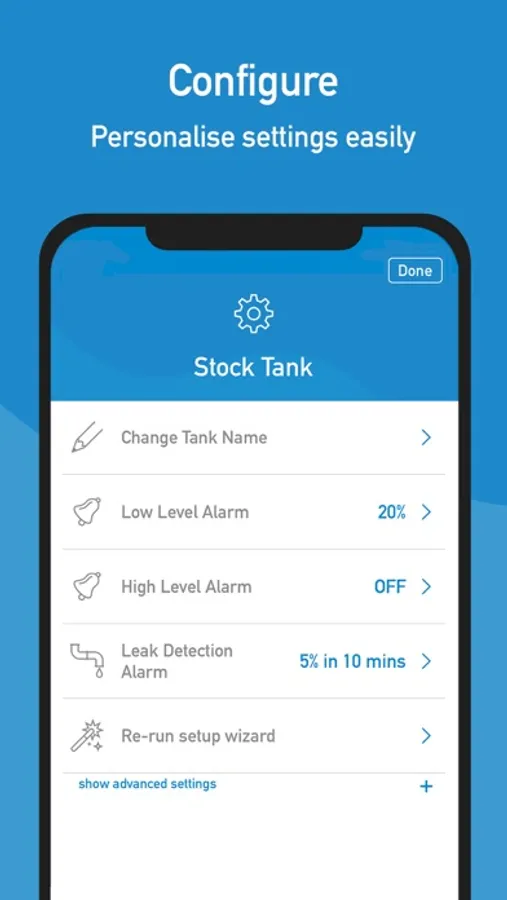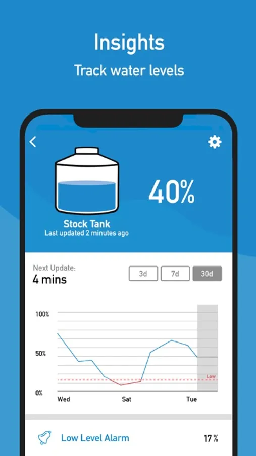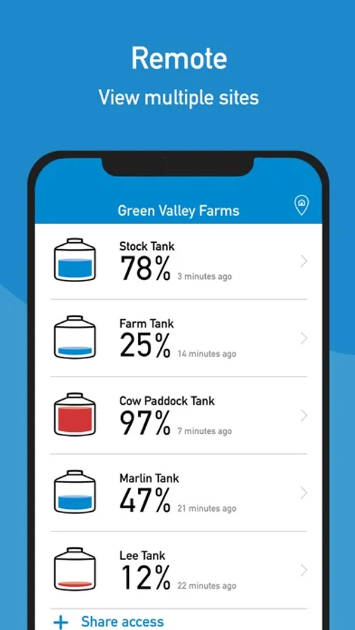 Monitor your water tanks with ease. The Waterwatch app shows tank level information for remote monitoring across the entire property. Set alerts for low levels and leak detection so you are never caught short again. Use the setup wizard to install and configure your new Waterwatch monitors in just 10 minutes with easy to follow, step-by-step instructions. You can now share access with staff and family members, change alarm configurations and view tank levels from the past week or month.