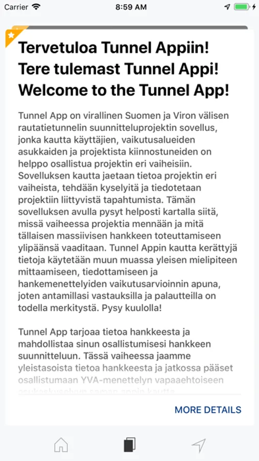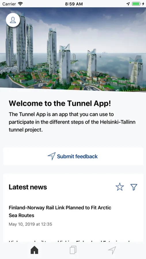 The Tunnel App is a mobile app that you can use to participate in the different steps of the Helsinki-Tallinn tunnel project. Get your voice heard and follow the process of the project using the app.