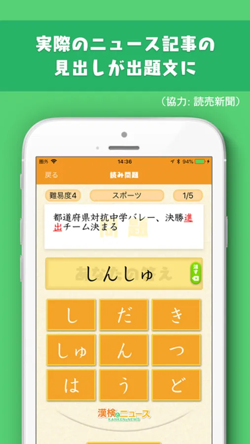 KanjiToNews is a kanji learning application developed in collaboration with the Japan Kanji Aptitude Testing Foundation (日本漢字能>力検定協会), Kyoto University, and the Yomiuri Newspaper (読売新聞). You can learn Japanese kanji used in the latest news.
