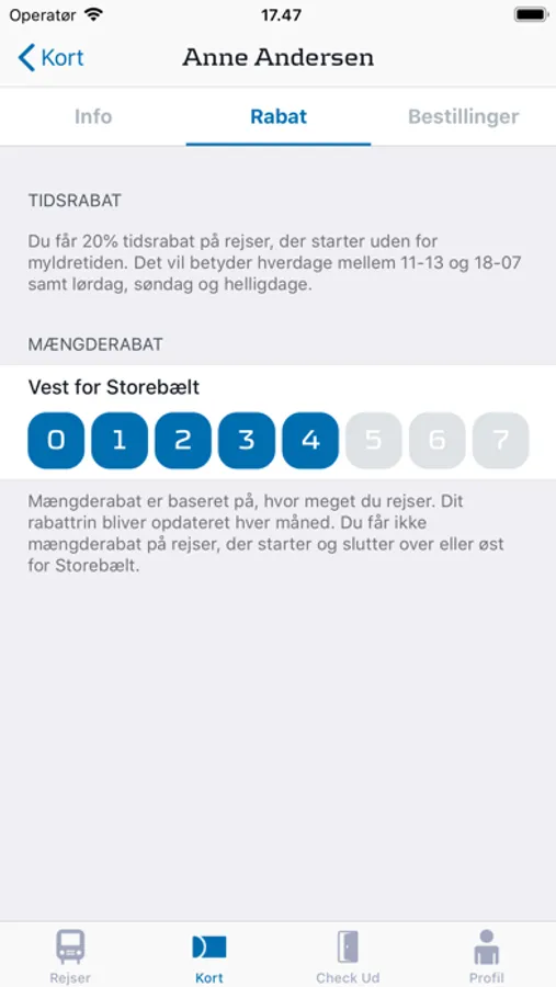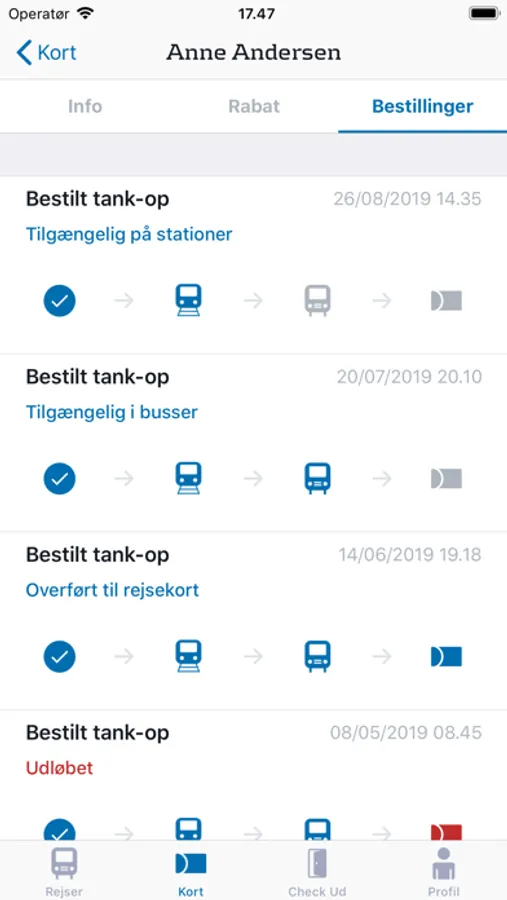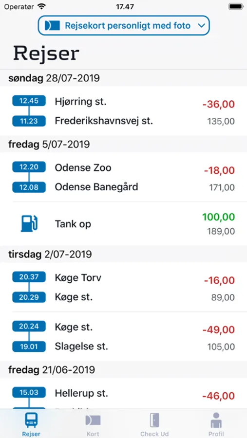 ◦ Se komplet historik over dine rejser og optankninger