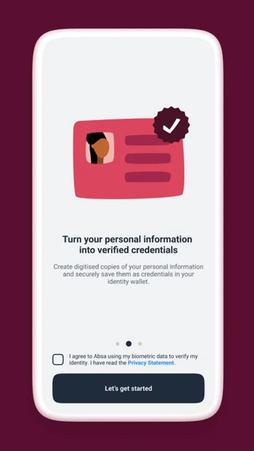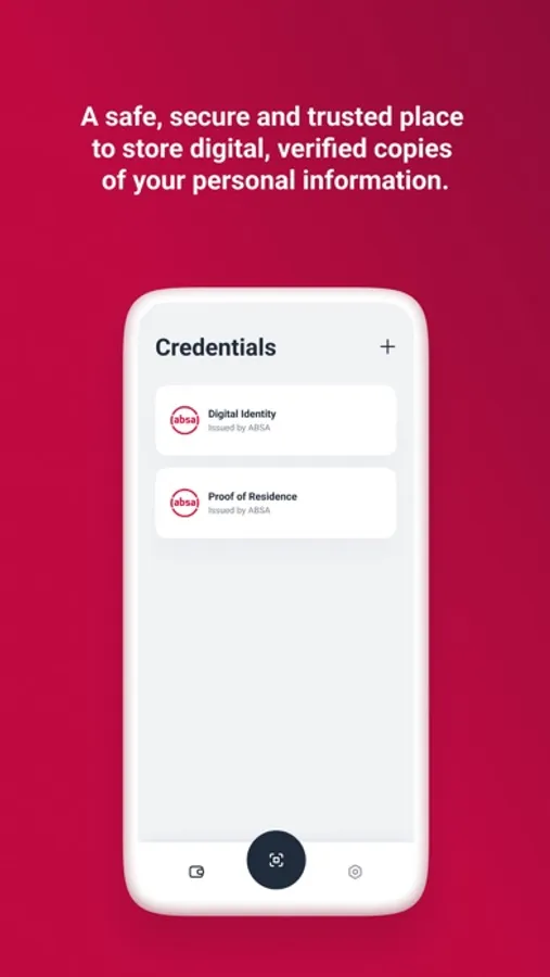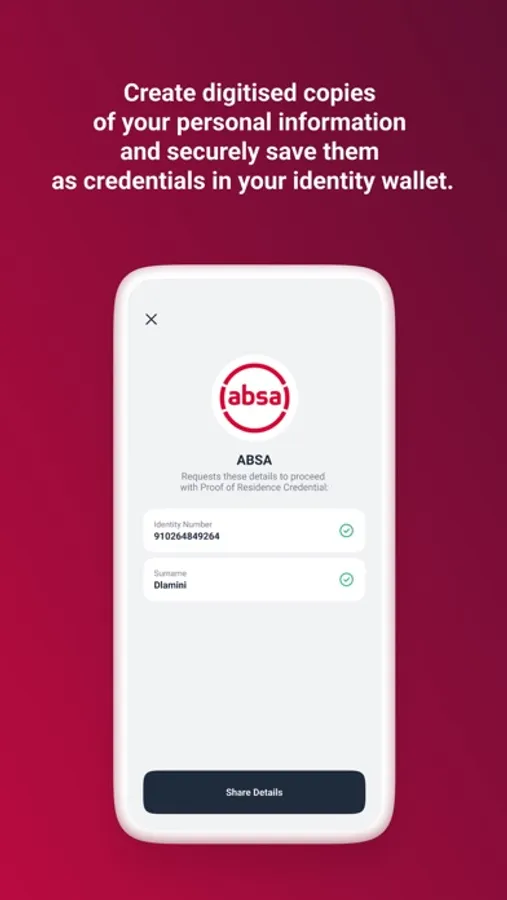 Absa Identity Wallet is a safe, secure and trusted place to store digital, verified copies of your personal information. Turn your personal information into verified credentials by creating digitised copies of your personal information and securely save them as credentials in your identity wallet. Share your verified credentials hassle free by scanning a QR code to effortlessly share your secure, verified information online with accredited organisations such as banks, telco’s, government agencies and more.