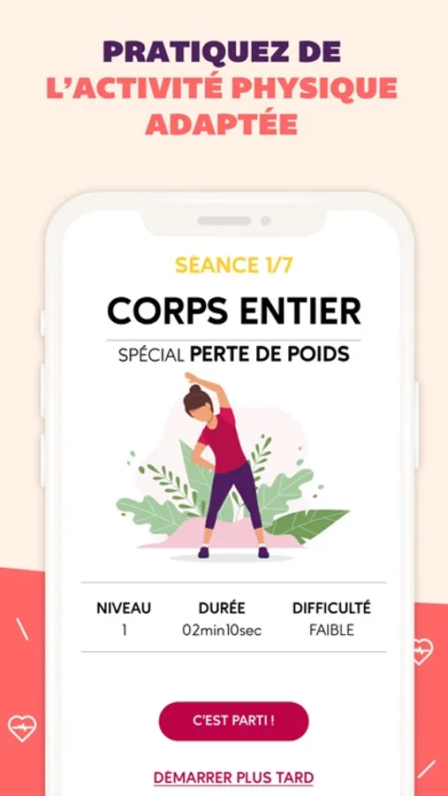 Définissez votre profil, vos jours d’entrainements et commencez une activité physique adaptée qui va, non seulement vous aider à atteindre votre objectif de perte de poids mais surtout, qui vous fera du bien physiquement et mentalement !