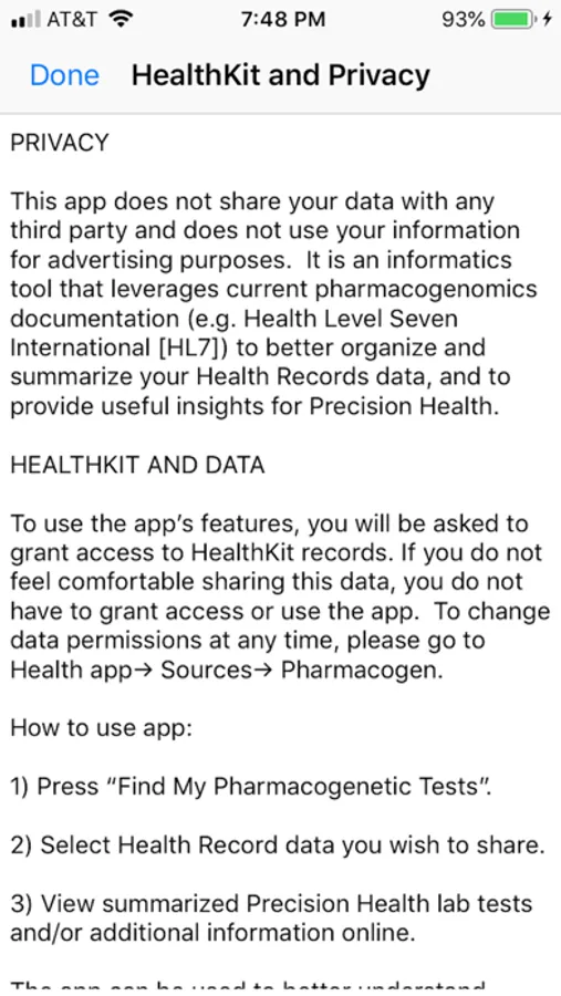 This app is an informatics tool that leverages current pharmacogenomics documentation (e.g. Health Level Seven International [HL7]) to better organize and summarize your Health Records data, and to provide useful insights for Precision Health. In a nutshell, this app searches all of a patient’s iPhone Health Records, finds the most relevant ones related to pharmacogenomics and Precision Medicine, and displays results as a clean, simple “snapshot” which the patient can discuss with their physician. This app is designed to work directly alongside Apple’s Health app to improve doctor-patient communication of precision medicine and pharmacogenomics results.