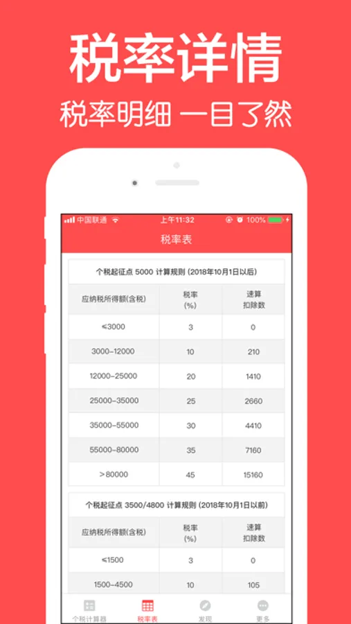 3.税率展示:表格形式展示出2018年10月以前和2018年10月之后的具体税率表。