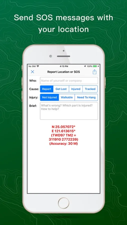 · Quick options for sending out SOS messages with location, type of accident and injury condition