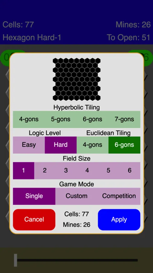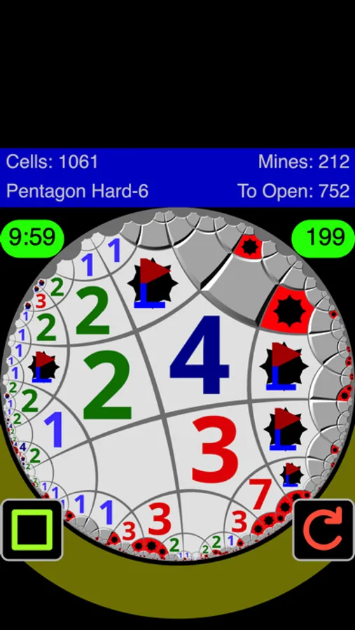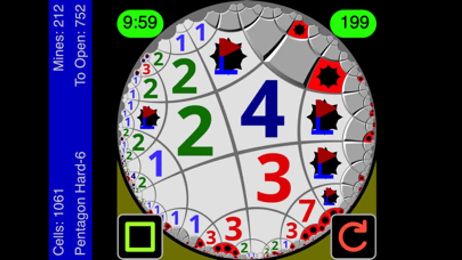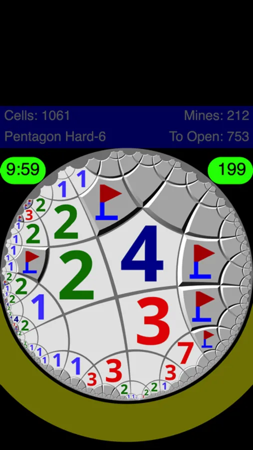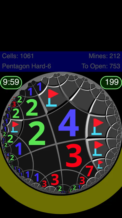 The game goal is to find out the locations of mines. Drag the circular playing field and tap cells to open them. If you open all cells that have no mine, you win. Hitting a mine by mistake, you lose the game.