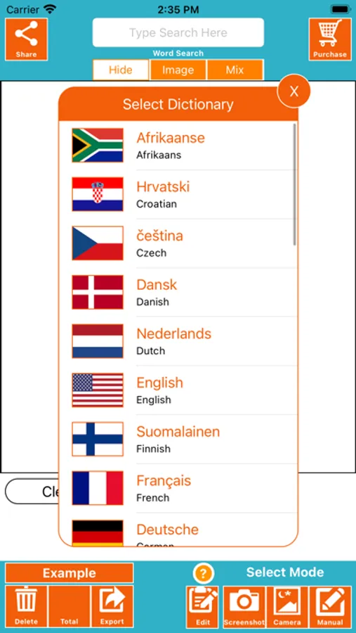 All Possible result automatically show according to dictionary and you can also search word by type in text box.