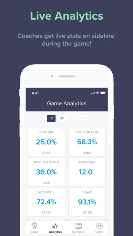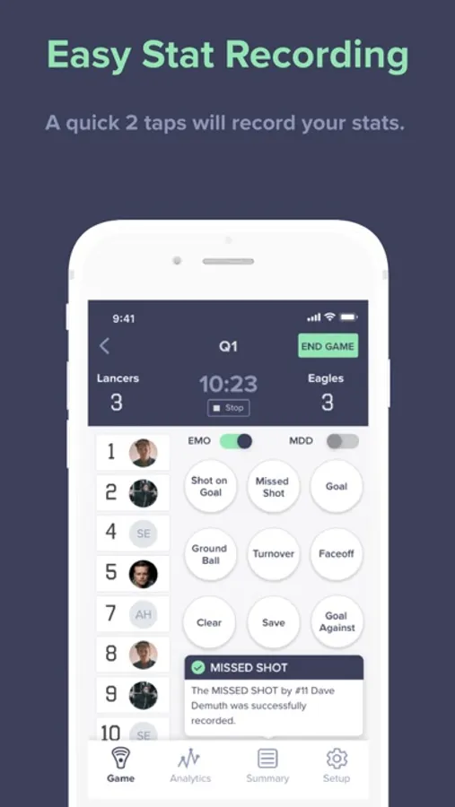 Capture lacrosse stats with two simple taps - player then stat, or stat then player. (All plans)