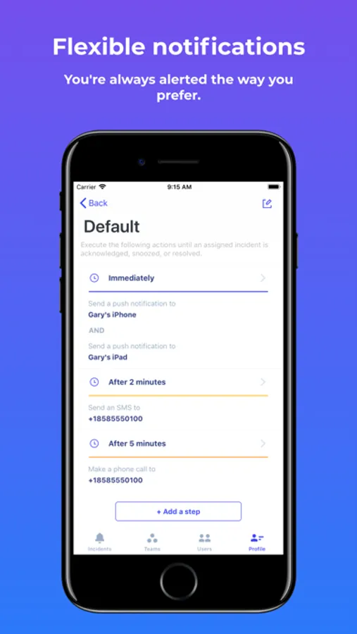 · Manage your personal preferences for getting notified about incidents assigned to you, allowing for precise timing configuration of push notifications, critical alerts (bypassing Do Not Disturb), emails, SMS messages, or voice calls
