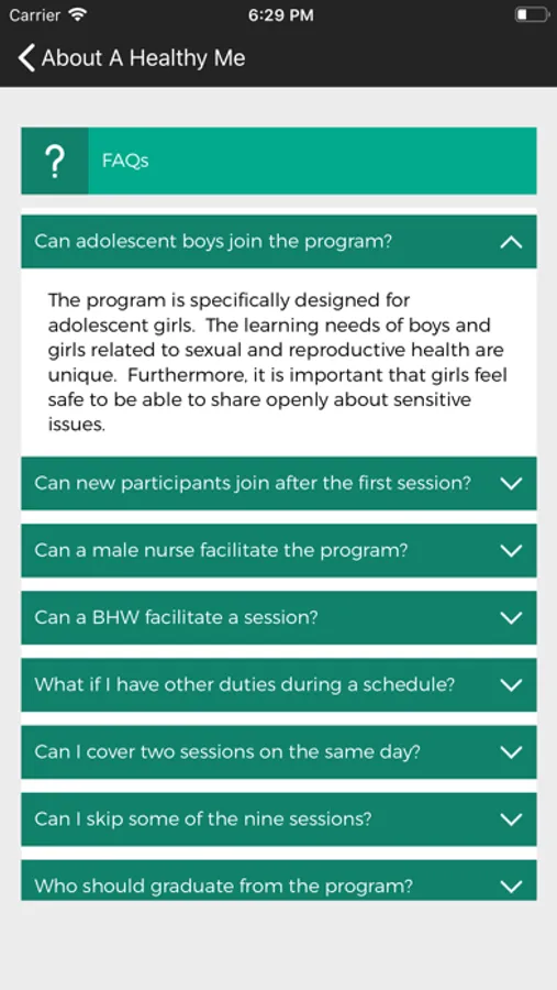 'A Healthy Me' is a holistic health and wellbeing curriculum which aims to support the development or reinforcement of knowledge, attitudes, life skills, and health behaviors that will empower adolescent girls and young women to make positive health choices and avoid negative outcomes.