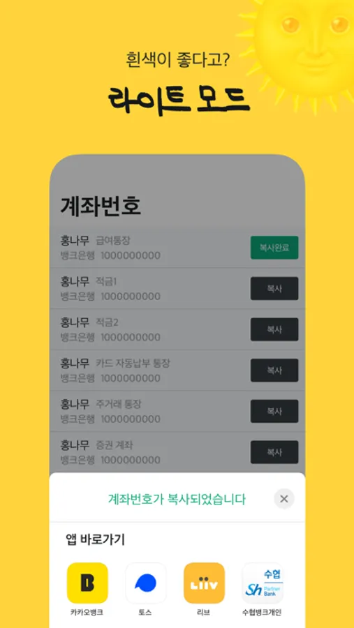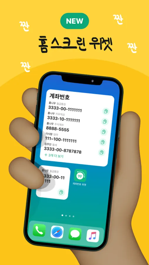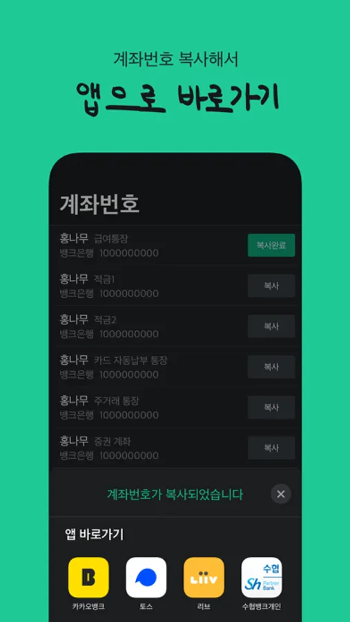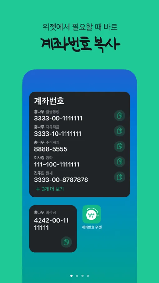 - 위젯에서 필요할 때 바로 계좌번호를 복사할 수 있어요.