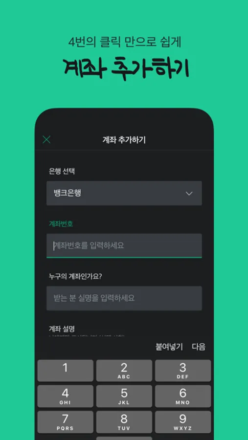 - 은행, 계좌번호, 이름만 입력하세요. 어떤 계좌인지 헷갈리지 않게 계좌 설명을 추가할 수 있어요.