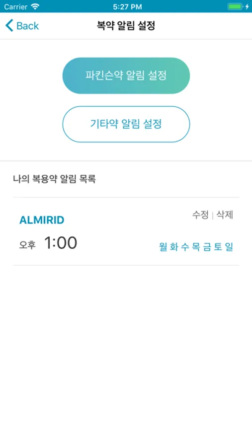 파킨슨약 및 기타약 알림 설정을 통하여 정확한 시간에 약을 복용할 수 있습니다.