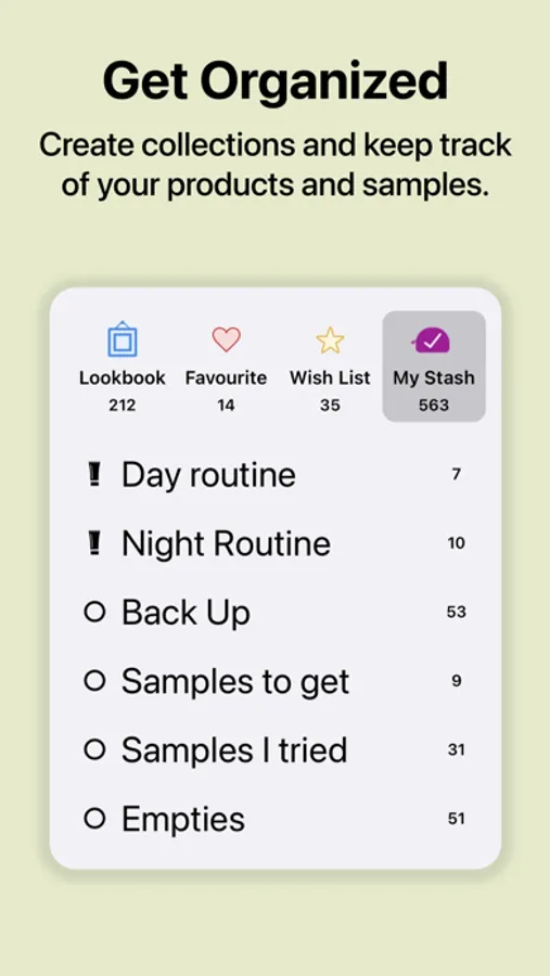 GlowinMe comes with default collections: My Stash, Wishlist and Favourite to help jumpstart your GlowinMe journey. You can also create custom collections of what is important to you such as products in your travel makeup bag, products to swatch, samples you have tried or want to try, and more!