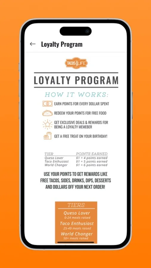 3. Get Free Stuff - Rewards you'll earn include free tacos, dips, desserts, and drinks. You'll also receive an Ultimate Trio for your birthday and exclusive offers only for loyalty members throughout the year.