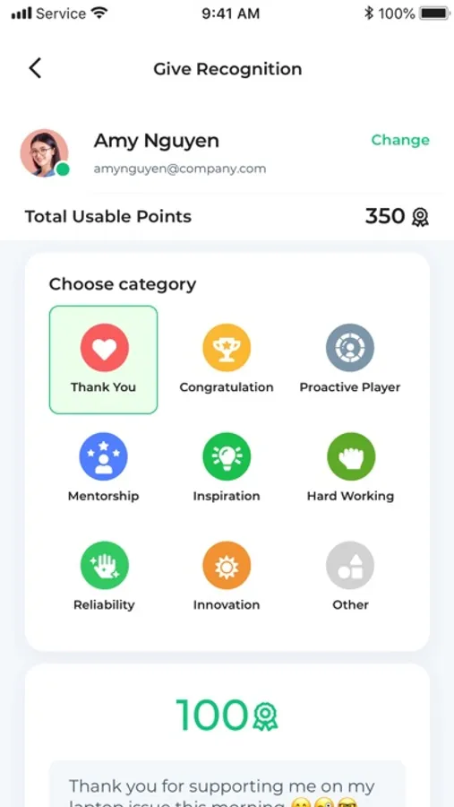 2. Peer-to-peer recognition: Show your team members how much you appreciate them with points and personalized messages