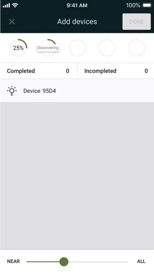 Using proximity sensing, the app creates a list of detected lighting devices. Up to 5 devices can be provisioned simultaneously. Using an RSSI filter, you can narrow down the list of visible luminaires to those that are the nearest.