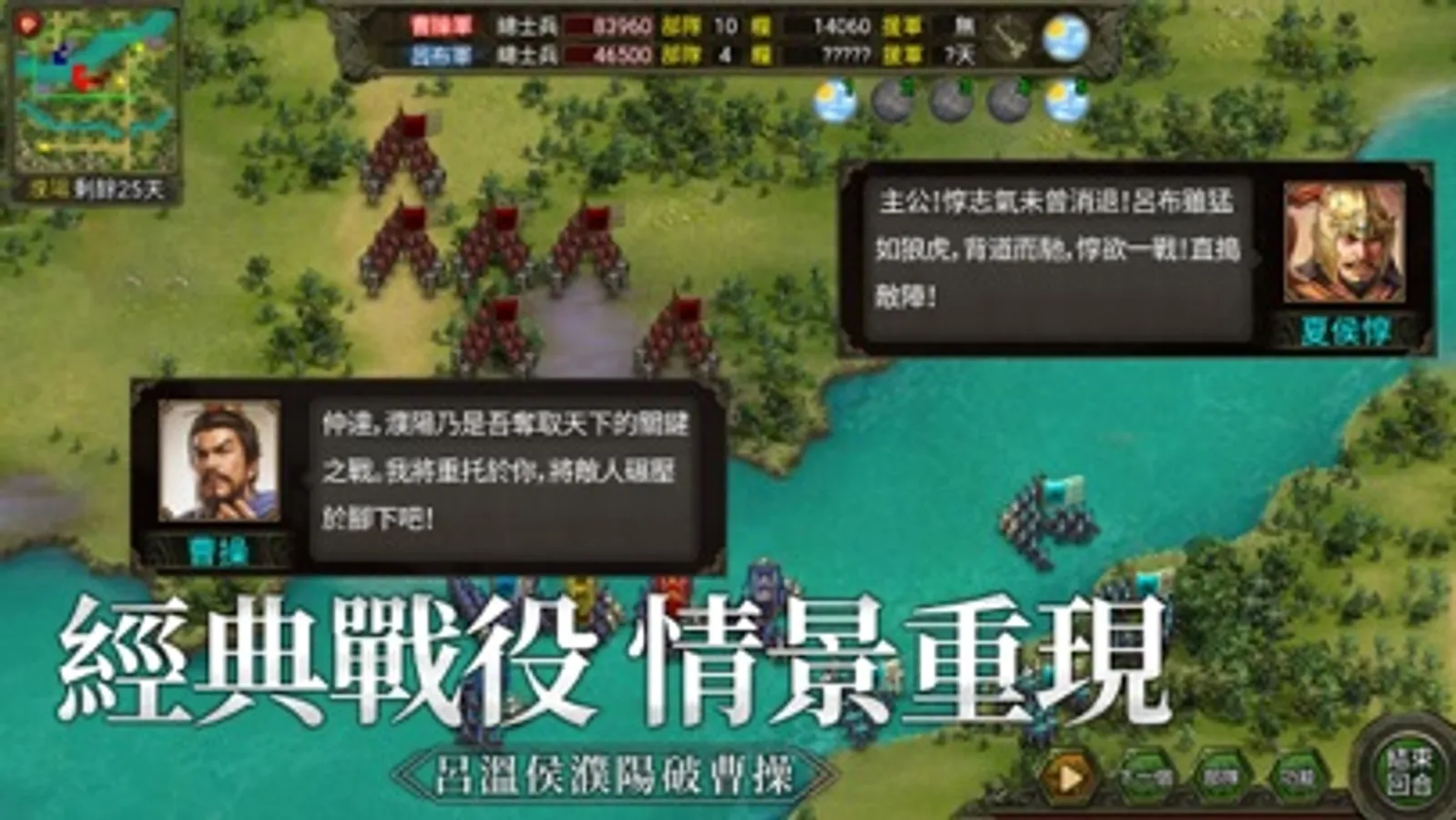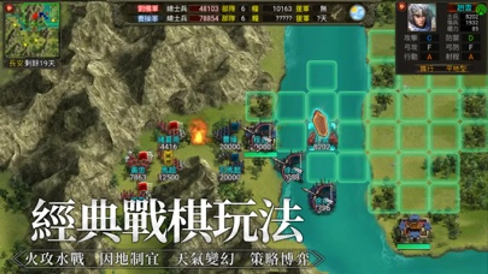 在戰斗場景中山河、湖泊、城關等不同地形上有變化多端的戰術組合,