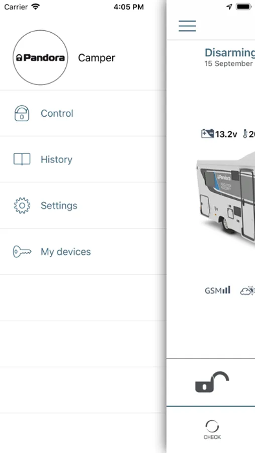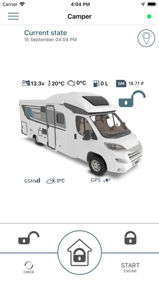 - Monitoring the current state of your Motor Home: statuses of all security zones and sensors (even trunk doors, windows and sunroofs), engine temperature,