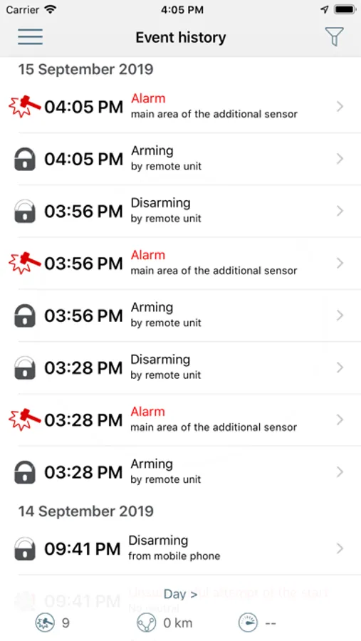 - History of events with coordinates, time and states of all security zones, sensors and other service information.