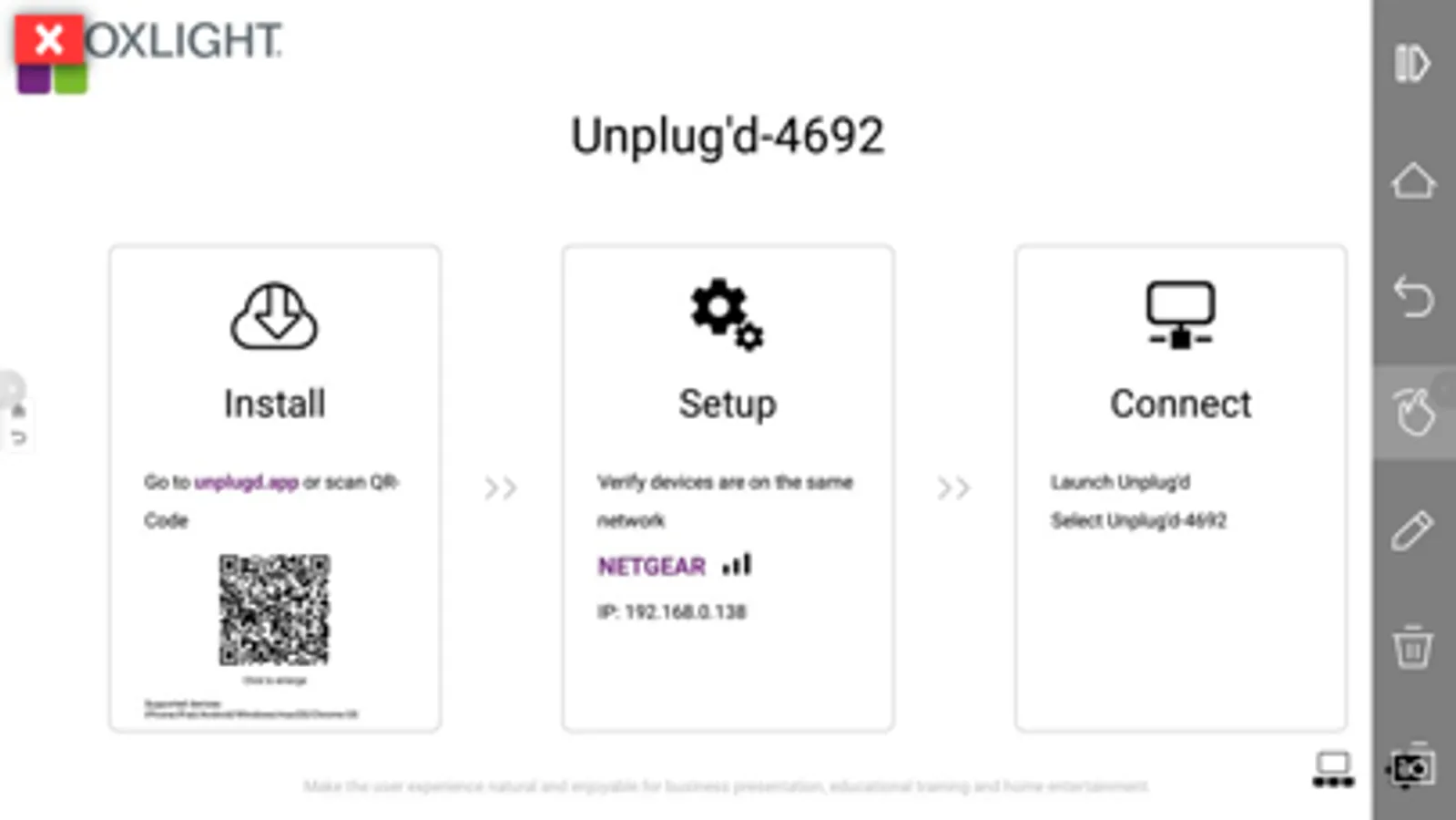 Boxlight Unplug'd screen streaming client software is the individual user complement to the Unplug'd screen streaming server software provided with Boxlight Series-2 interactive flat panel displays.
