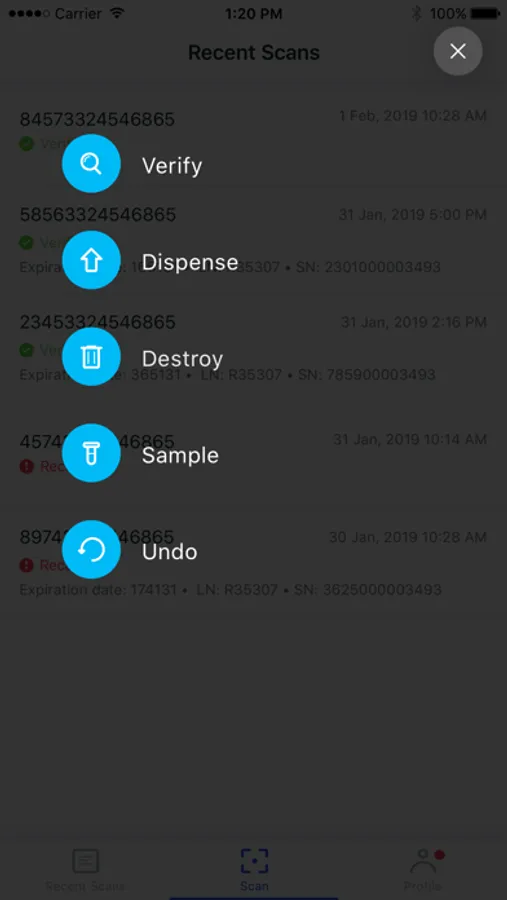 Smart Rx Manager uses your device's camera to scan the 2D bar codes that are required by FMD. Smart Rx Manager can also be paired with a wireless bluetooth scanner to provide maximum flexibility when verifying or decommissioning prescription drugs. Reporting screens allow you to review all your scan data to review status as well as have insight as to when medicines may expire.