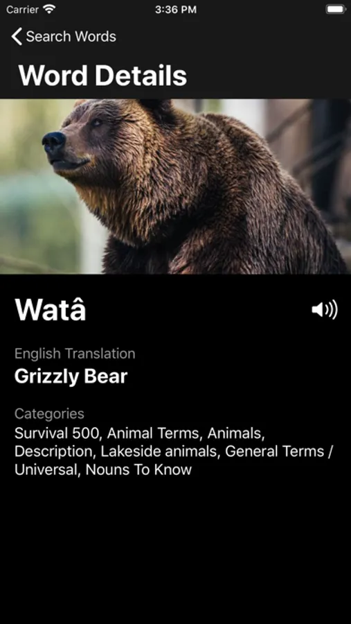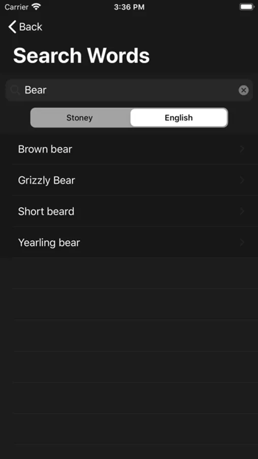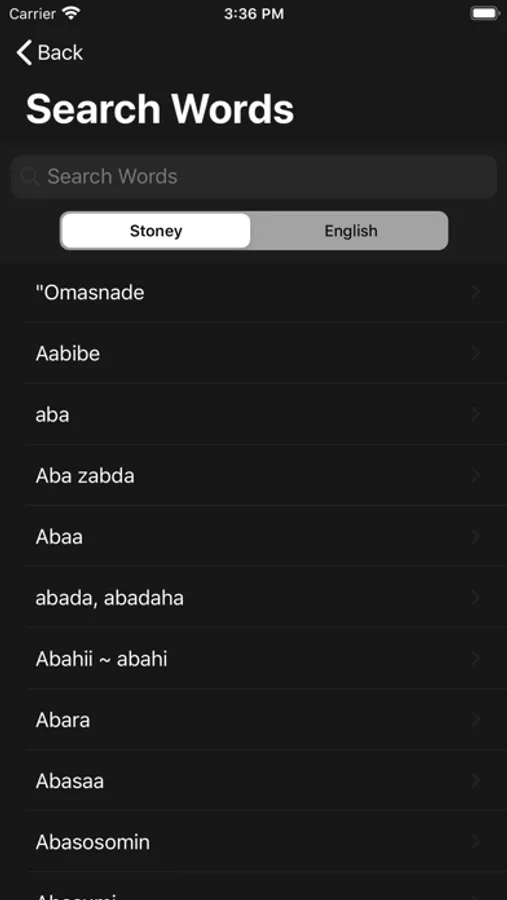 The entire dictionary can be searched in either Stoney or English. Words can also be searched by category.