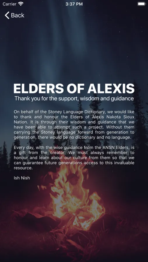 The Stoney Language Dictionary aims to bring the Stoney language into the modern age. Working closely with the Elders of the Alexis Nakota Sioux Nation, the dictionary contains thousands of words and is continually being updated with new words and definitions to help preserve the Stoney language and pass it on to the younger generations.