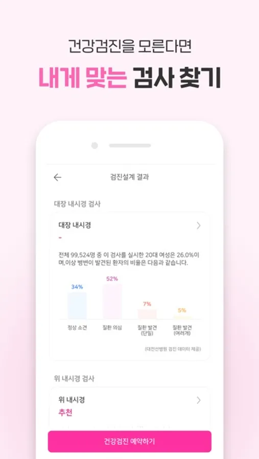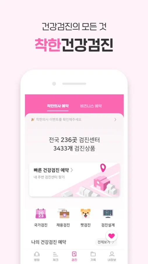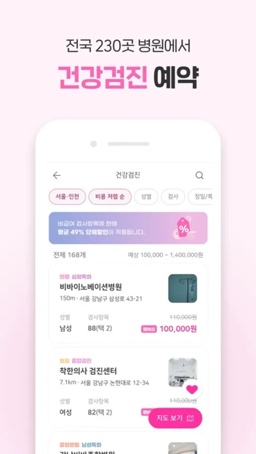 이제 건강검진도 합리적이고 현명하게 받아보세요! 대기업 임직원만 받았던 건강검진 할인가로, 검진센터 검색, 예약, 결제까지 쉽고 빠르게.