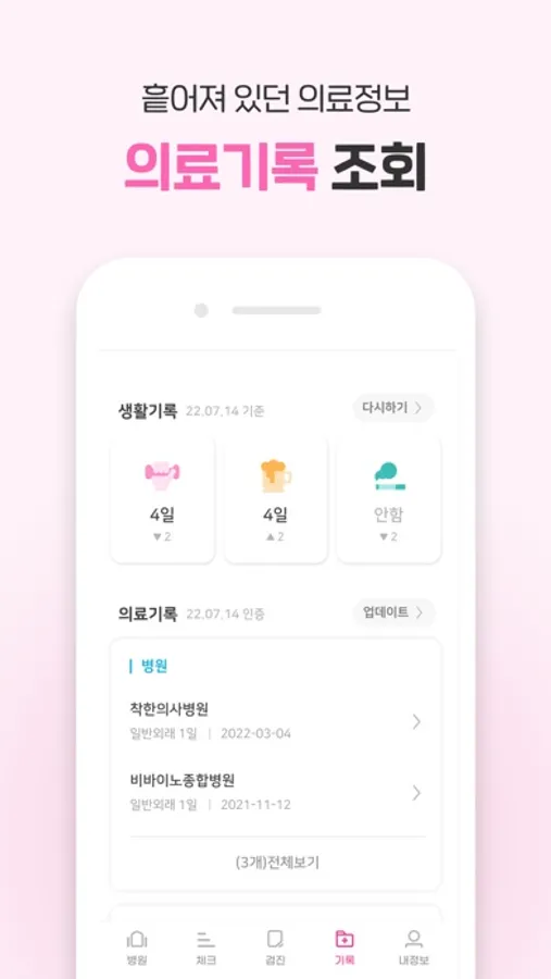 내 의료기록을 모바일로 조회하고 필요한 뉴스만 읽어보세요! 병원 방문기록, 약 처방내역, 검진결과 조회, 맞춤형 뉴스 추천까지.