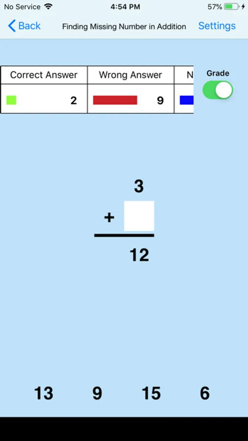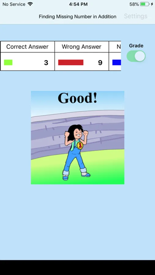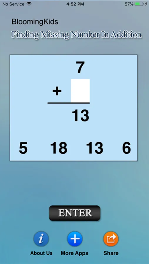 In this app there is an addition problem at the top of the screen with the second number blank. The app voice says (for instance) “Ten plus what is sixteen? Click the correct answer." There are four numbers at the bottom of the screen, and the student should click the correct choice from among them. If the student clicks the correct number, the voice says “Yes, ten plus six is sixteen."