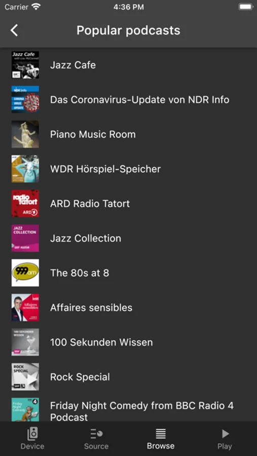 Search for individual content of the streaming sources with this app (the navigation structure for UPnP sources will be saved in your UPnP service). As soon as the PLAY button is pressed, the app will automatically switch to play view.