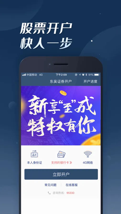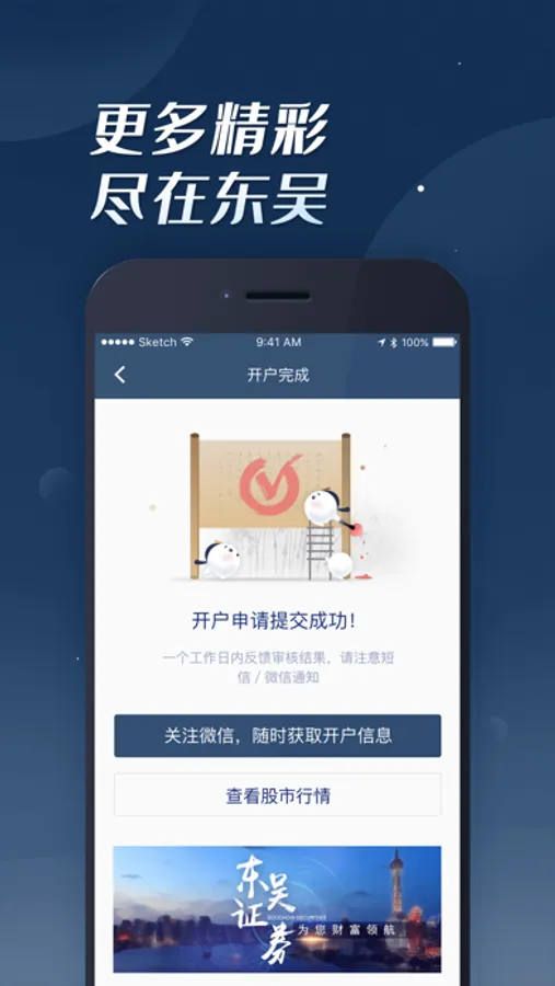 东吴证券开户专用APP,超低佣金,足不出户,7*24小时自动受理,无需排队,3分钟完成股票基金开户、证券转户,开启您的创富之旅!