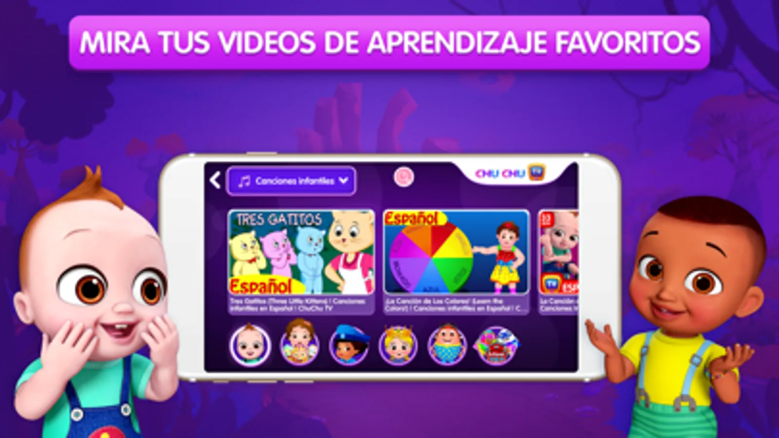 El contenido de ChuChu TV promueve valores morales para los niños como amar, cuidar, compartir y ayudar a los demás. A los niños les encanta cantar y bailar mientras ven sus videos favoritos de ChuChu TV y aprenden el alfabeto, los números, las canciones infantiles, los colores, los animales salvajes, los animales de granja, las frutas, las verduras, los vehículos, acciones, los días de semana, los meses y mucho más.