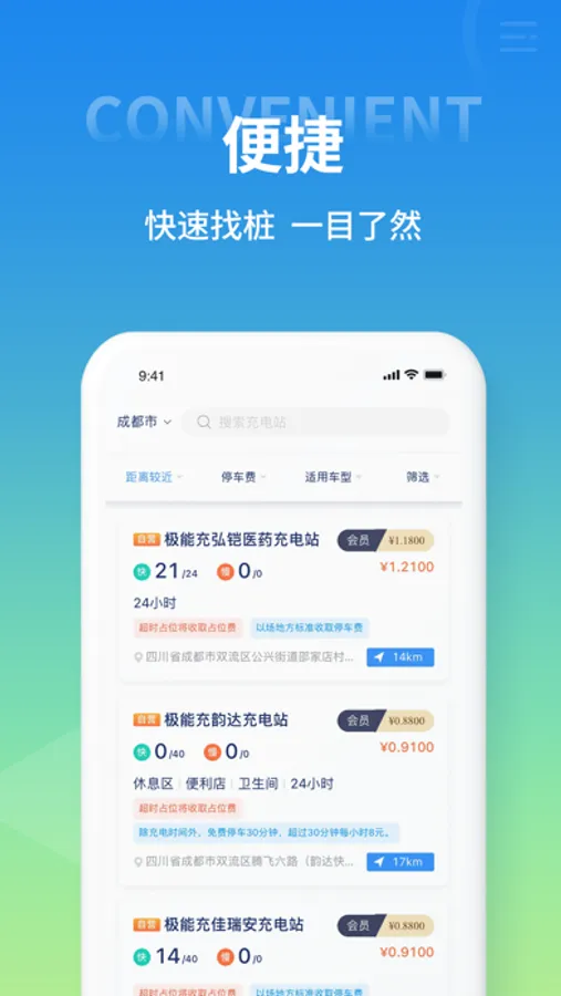高效找桩:充电场站精确查找、充电地图精准定位、充电场站智能推荐,为用户提供最优质的充电桩寻找服务;