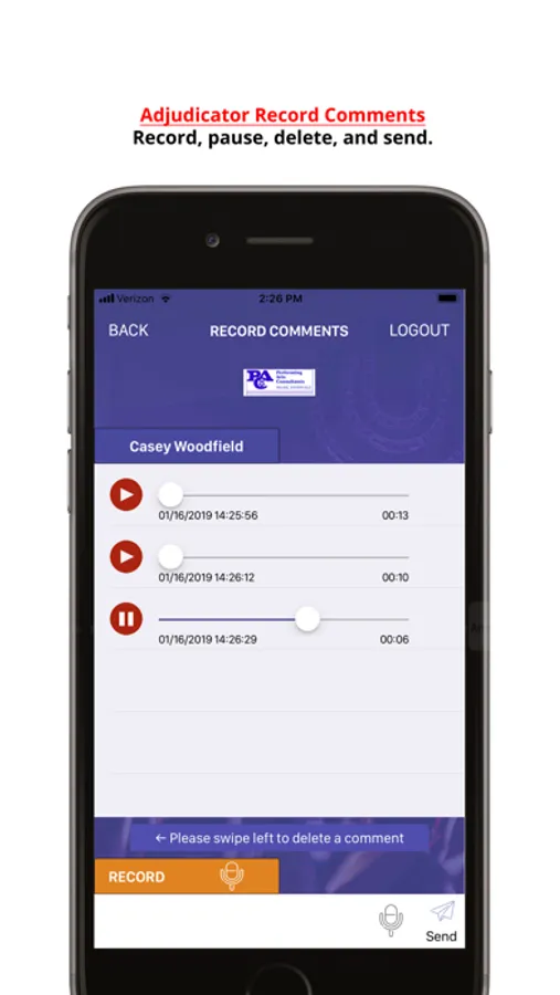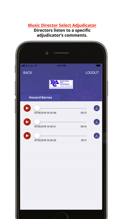 A simple app that allows music adjudicators to leave verbal comments while judging music groups attending festivals with competing groups. Music directors have secure access to listen to comments specifically about their group. They can be reviewed on their phone or the website, musicadjudicator.com, by entering their unique username.