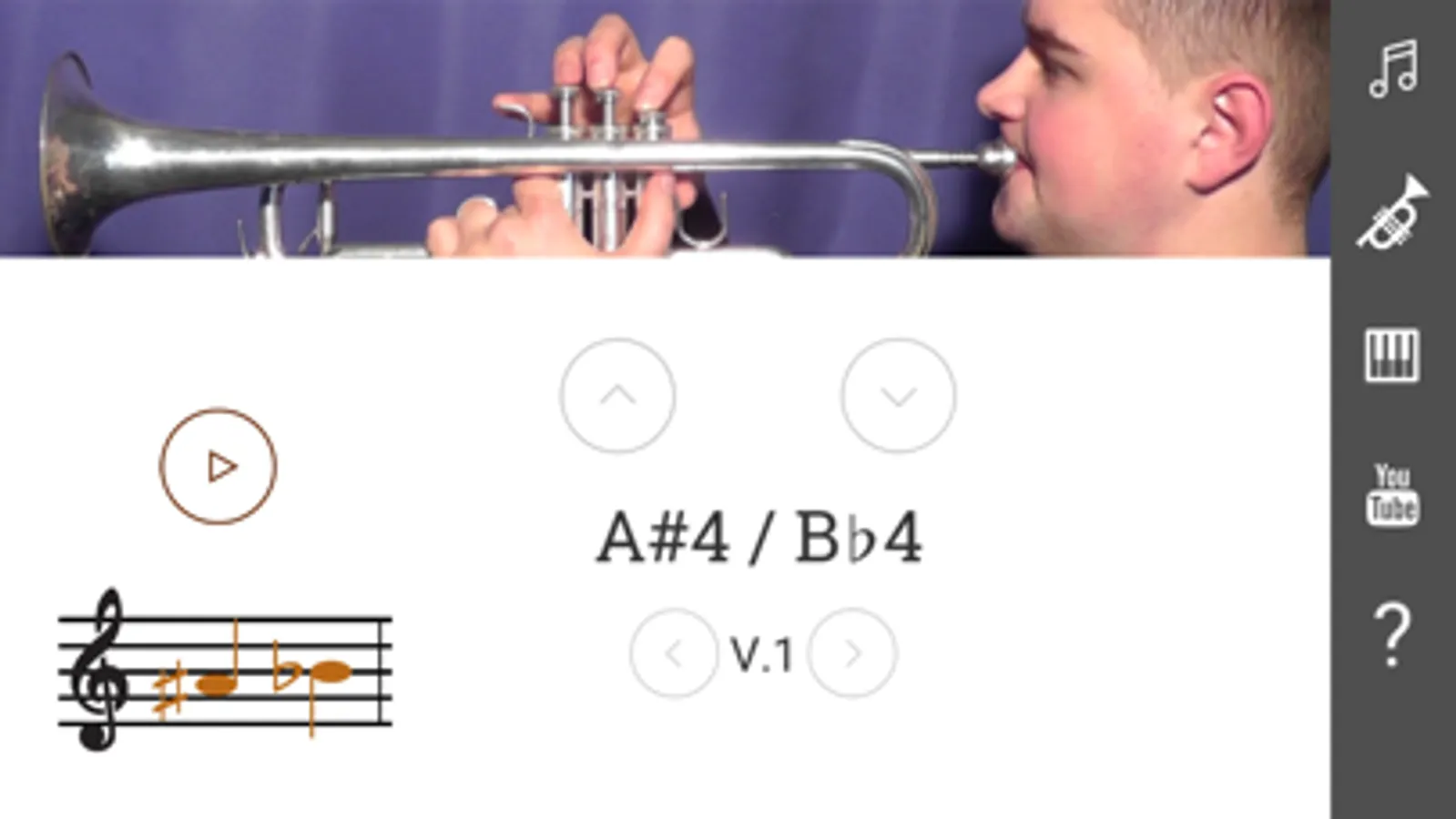 2D Trumpet Fingering Chart - How To Play Trumpet shows you the position of the fingers on the instrument. You can hear the sound of each musical note. There is demonstration by a live trumpet player. There is a section with trumpet lessons. You can choose different types of trumpet: Trumpet Bb, Trumpet C