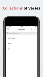 Collections allow you to place any number of chosen verses under a given title making it simple for you to view and read them collectively. This swift referencing action is useful for grouping specific verses that fall under a topic or header that you are currently working on or refer to frequently.