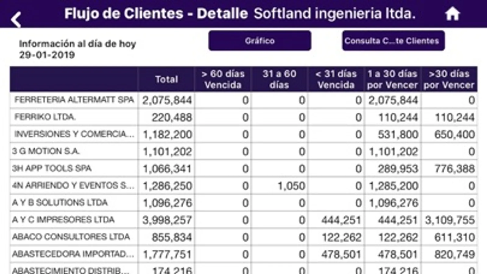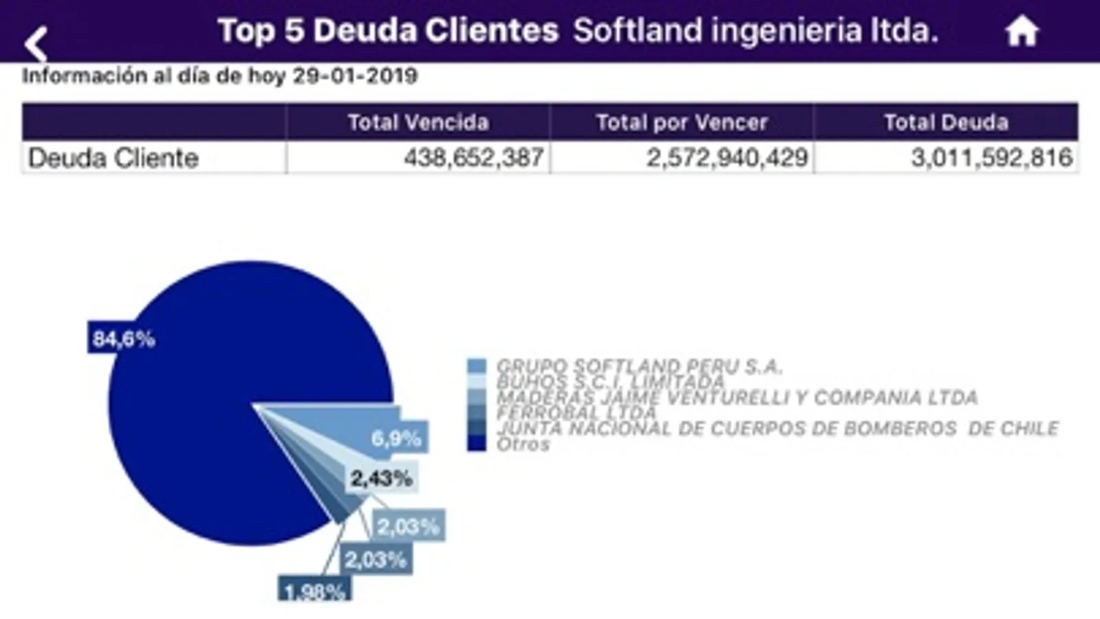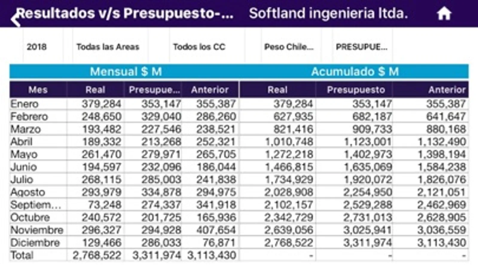- Finanzas: obtendrá en todo momento el resultado entre los Ingresos y egresos, comparando con el presupuesto, tanto a nivel global como detallado por cuentas, así como el Flujo de Caja, con los ingresos presupuestados en base a las cuentas por cobrar, y los egresos en base a las cuentas por pagar, estratificado de acuerdo a lo vencido y lo por vencer, visualizando los top 5 de clientes y proveedores que conforman la concentración de deudas.