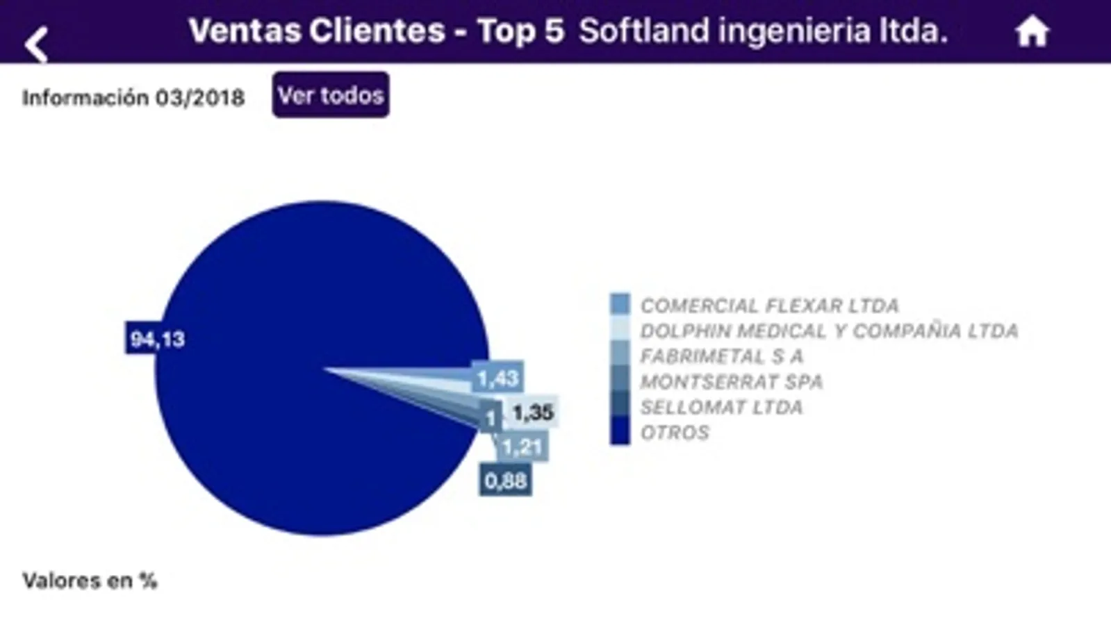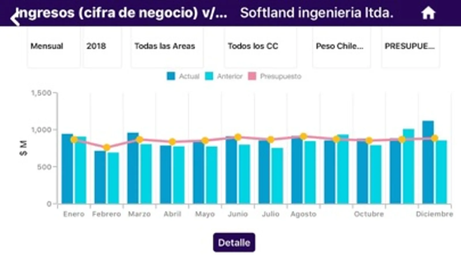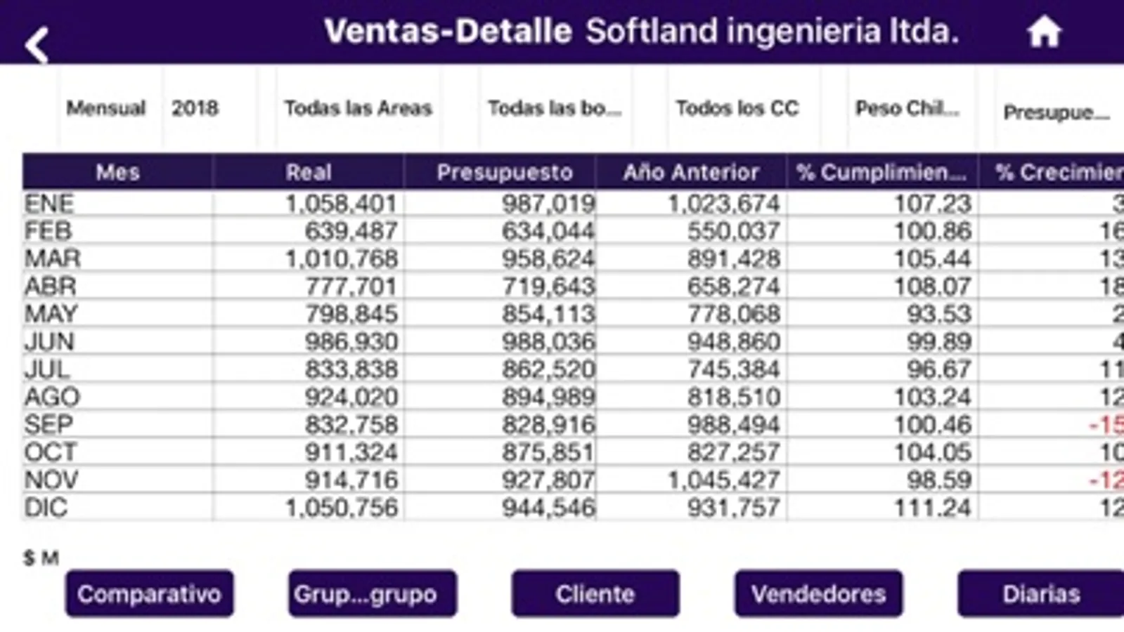 - Comercial: revisar y controlar las ventas a la fecha, acumuladas o detalle diario, comparando con el presupuesto establecido y las ventas al año anterior, tanto global como detallado por Grupo y Subgrupo de productos. Así también podrá tener un ranking de los mejores clientes y vendedores.
