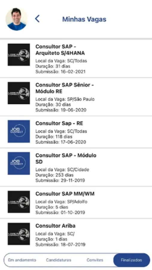 * Administração de suas vagas em andamento, suas candidaturas, convites recebidos e um histórico de vagas finalizadas de forma eficiente;