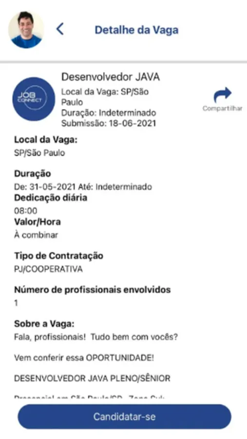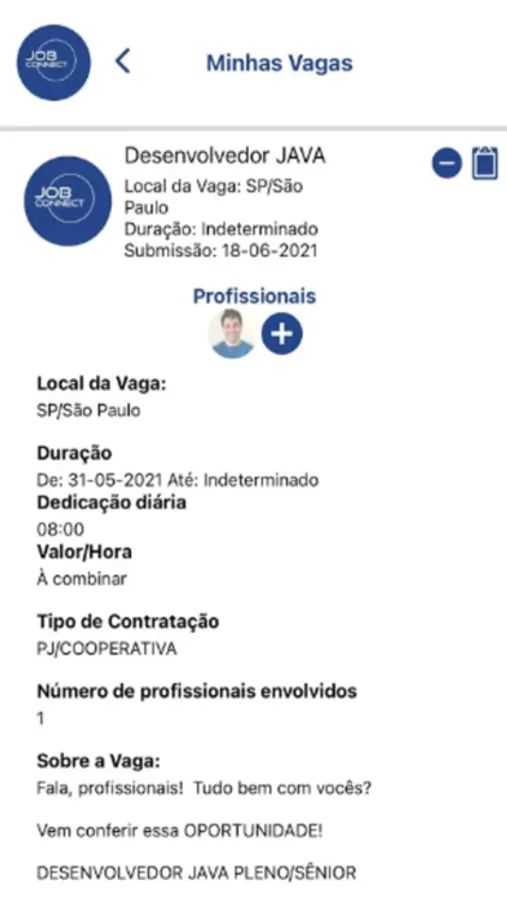 * Todas as vagas são compartilhadas em todas as redes sociais da JOB como: Instagram, mais de 2Mil Grupos do Facebook, LinkedIn, Telegram, Skype, entre outras. As vagas também são compartilhadas pelos próprios profissionais de dentro da plataforma;