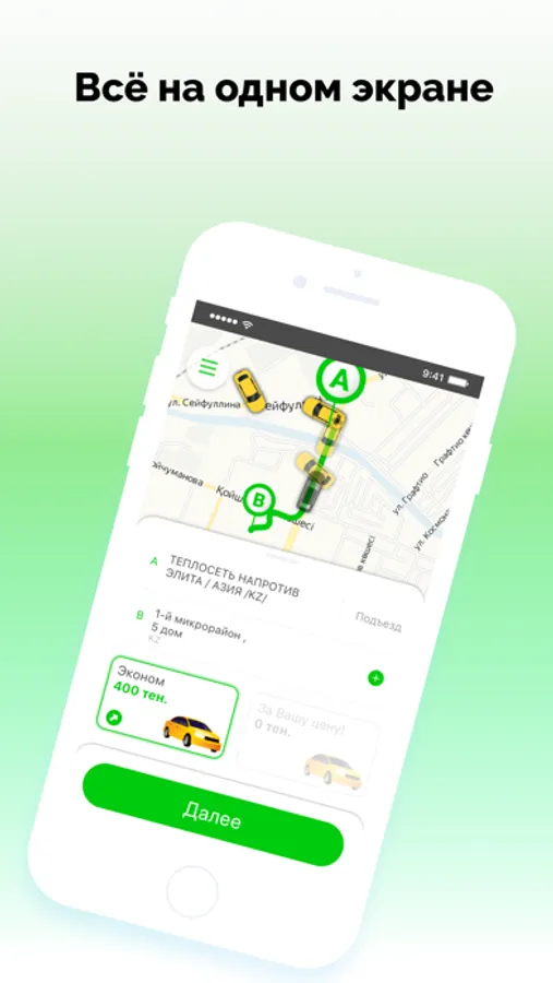 Приложение автоматически определяет ваше местоположение в городах Қонаев, Алматы. Достаточно указать лишь конечный пункт назначения.