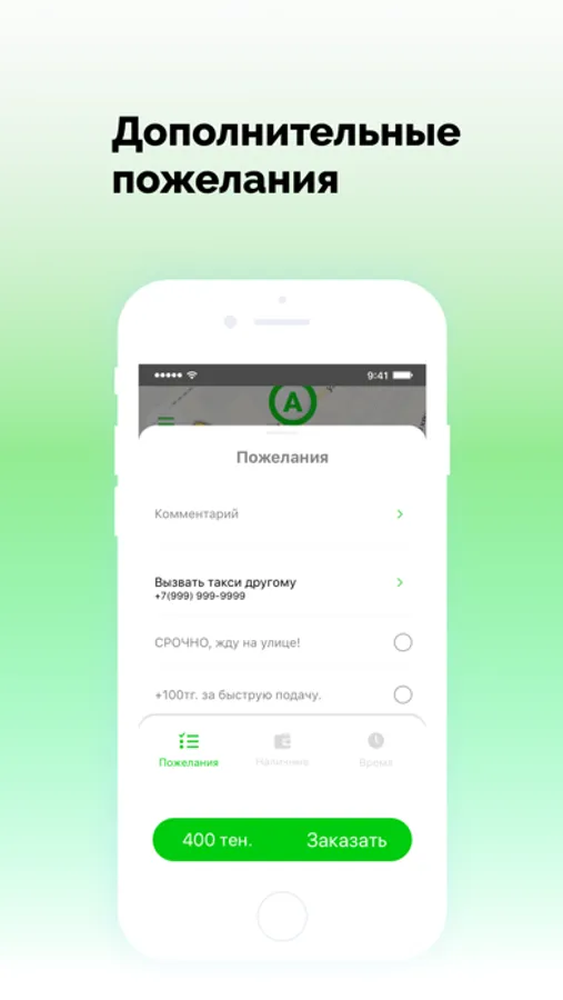 Укажите необходимые пожелания перед заказом (курящий/некурящий салон, перевозка животных, большой багаж, кондиционер, встреча с табличкой).
