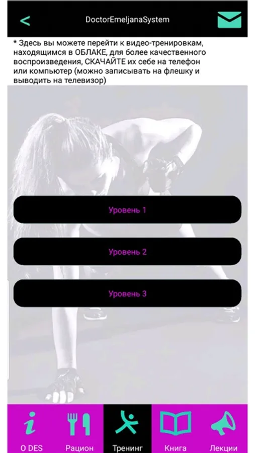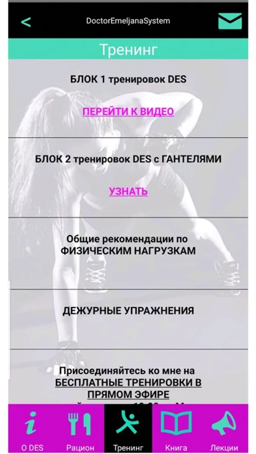 2. ТРЕНИРОВКИ DES. Девять 30-минутных интенсивных жиросжигающих тренировок для дома от Катерины Емельяны для проработки разных зон трех уровней сложности - "Включай и повторяй!". Также общие рекомендации по физической нагрузке и дежурные упражнения.