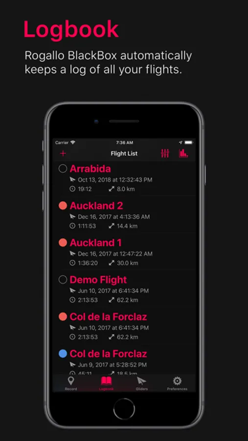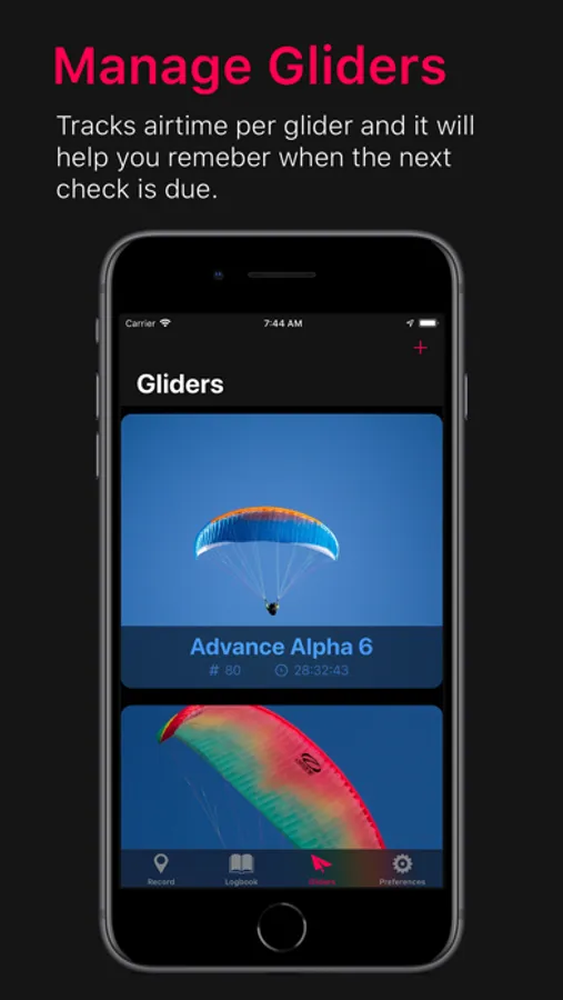 The app keeps track of the airtime that you have flown with every one of your gliders. Also it will let you filter the statistics per glider, so you can get a more detailed understanding of the performance differences of your wings. Finally Rogallo BlackBox will help you remember when the next check is due for every one of your gliders.