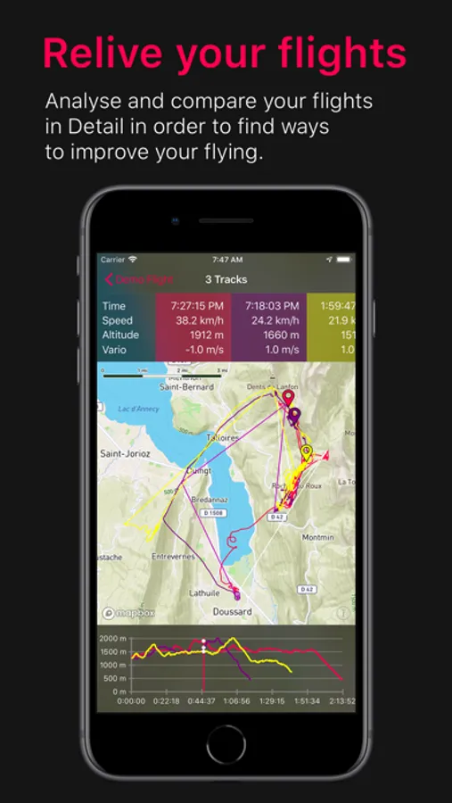It goes without saying that Rogallo BlackBox calculates XC score and many other values that will help you understand a particular flight. But on top of that, it is possible to compare multiple flights visually on a map. This will help you to find ways where you can improve your flying in the future.