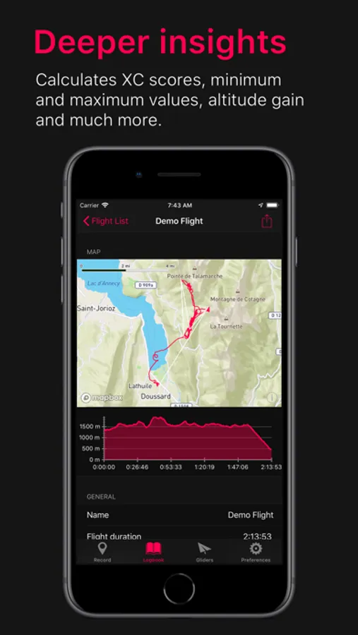The app is designed to be the perfect flight documentation tool. It will record your flights as signed IGC files that can be uploaded to all major XC contest like DHV-XC and XContest from within the app. Also the app is capable of providing useful in-flight information either visually or via audio.