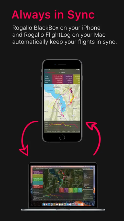 Rogallo BlackBox can sync all of your flights to Rogallo FlightLog on your Mac via iCloud. This means that when you open Rogallo FlightLog on your Mac, your latest flights are already there without you ever having to touch an USB cable anymore. For more information on Rogallo FlightLog for Mac please visit https://rogallo.app/RogalloFlightLog