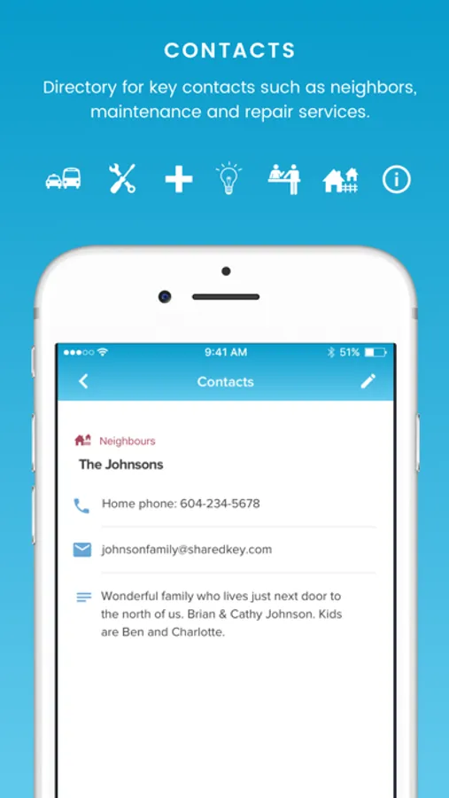 Contacts - Useful listing for contacts such as neighbors, repairmen, emergency services, etc.